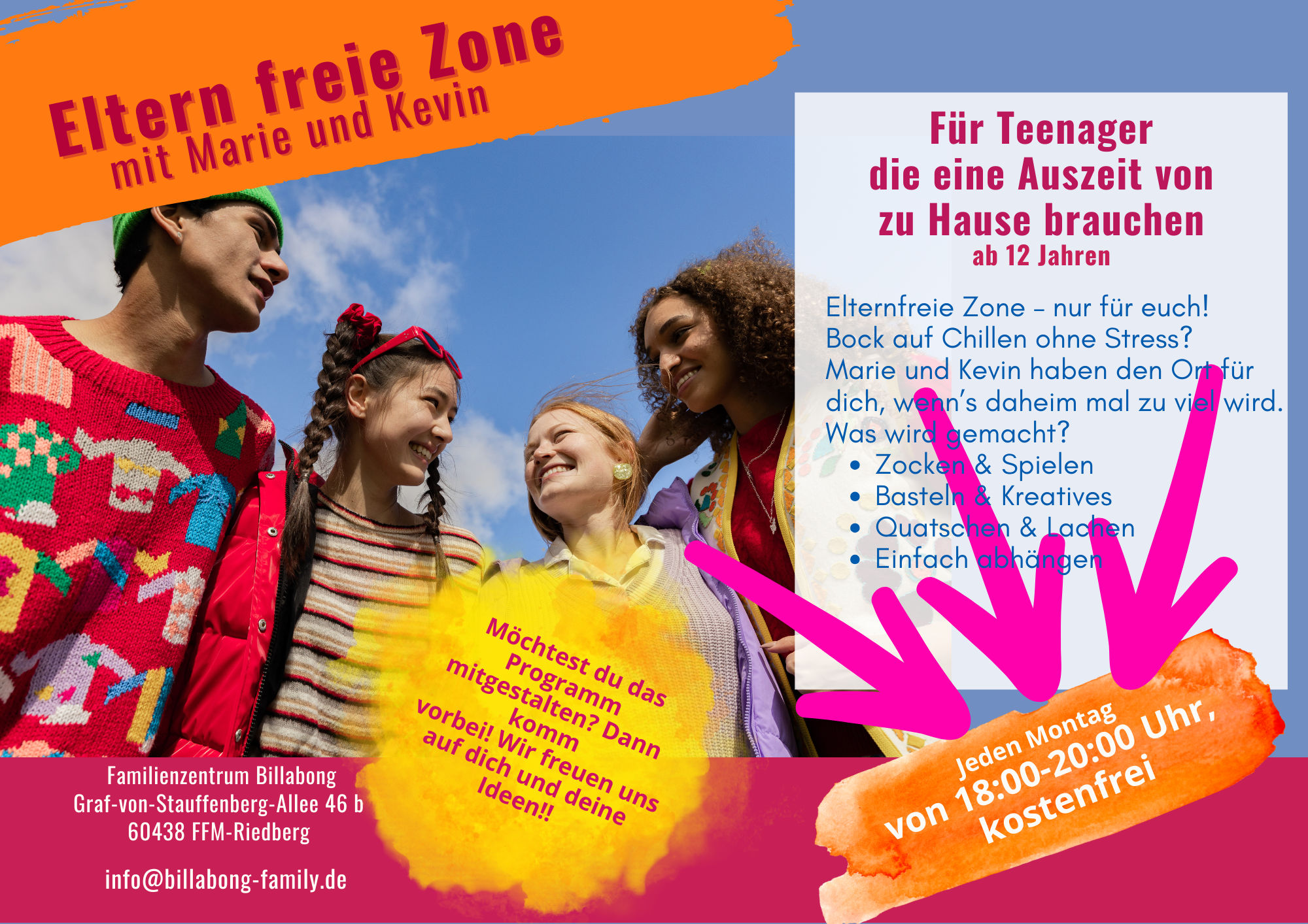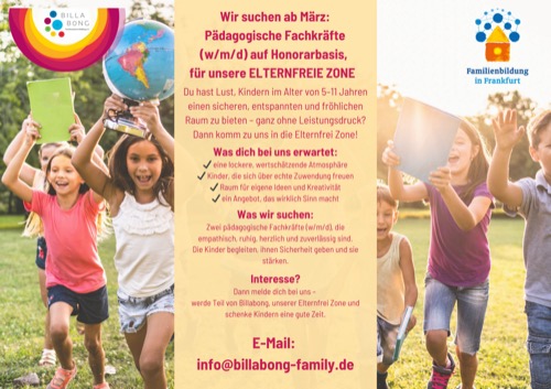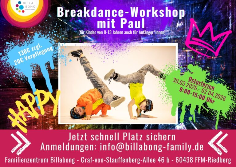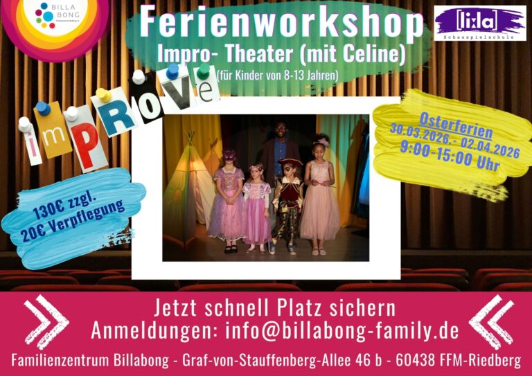Herzlich willkommen auf der Homepage des Familienzentrums und Mehrgenerationenhauses Billabong im Norden von Frankfurt! Wir sind ein eingetragener Verein, der sich der Förderung des Miteinanders im Riedberg verschrieben hat. Unser Ziel ist es, die Bewohner*innen des Riedbergs und darüber hinaus, zusammenzubringen und eine lebendige Gemeinschaft zu schaffen.
